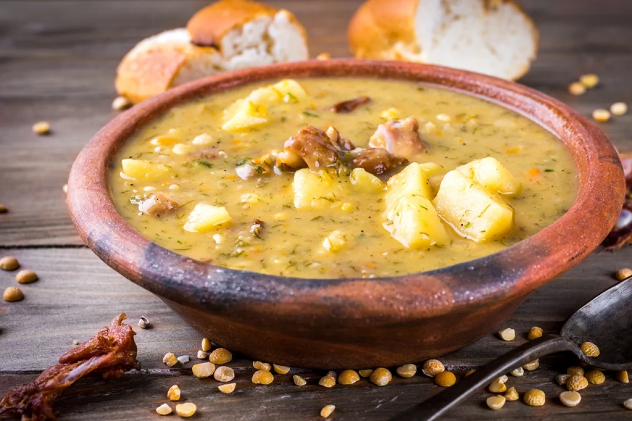 - Горох – 400 г * Мясной бульон – 1.5 л * Батат замороженный — 400 гр * Зелень – 0.5 пучка