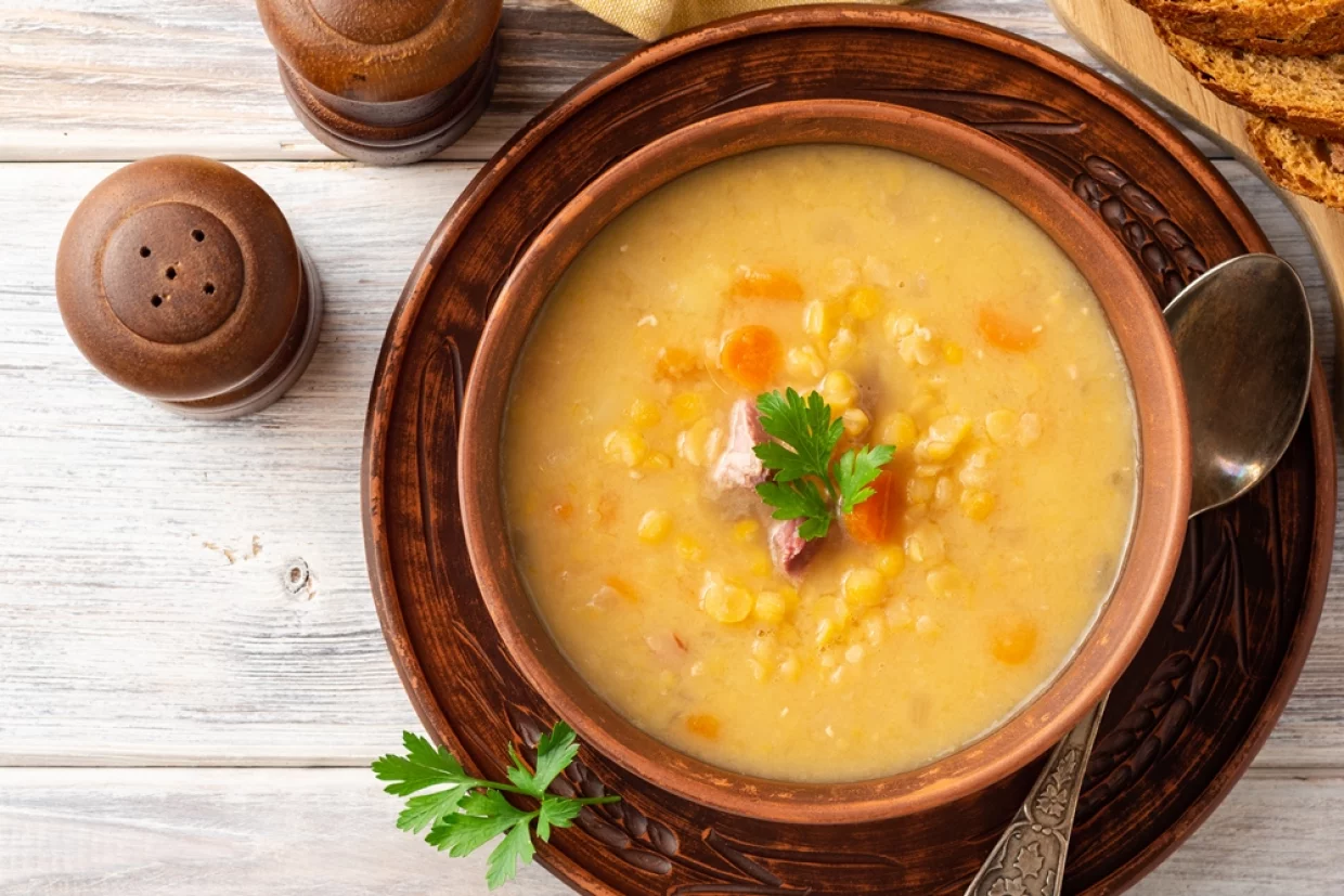 - Копчености – 200 г * Горох (колотый) – 200 г * Кукуруза – 150 г * Морковь – 2 штуки *