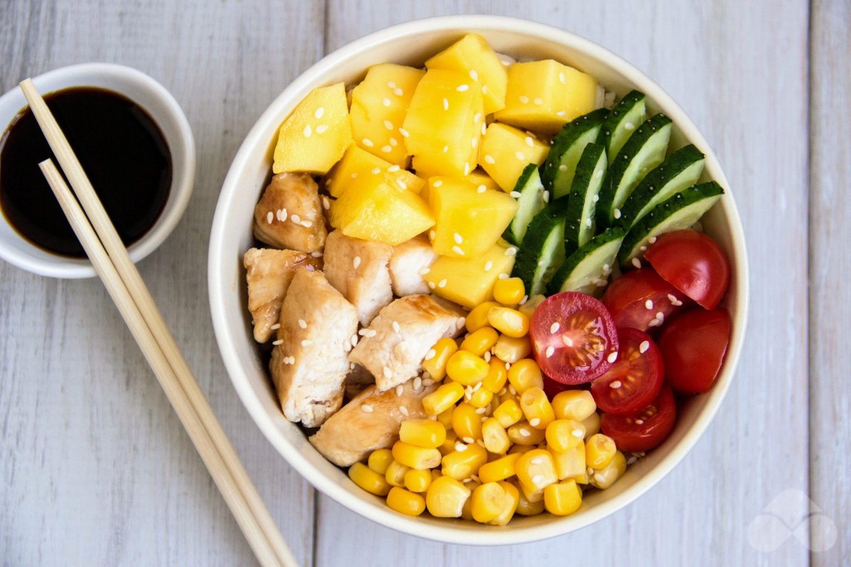 - Рис – 1 стакан * Куриное филе – 2 шт. * Помидоры – 1 шт. * Огурцы – 1 шт. * Манго замороженный – 0,5 шт.