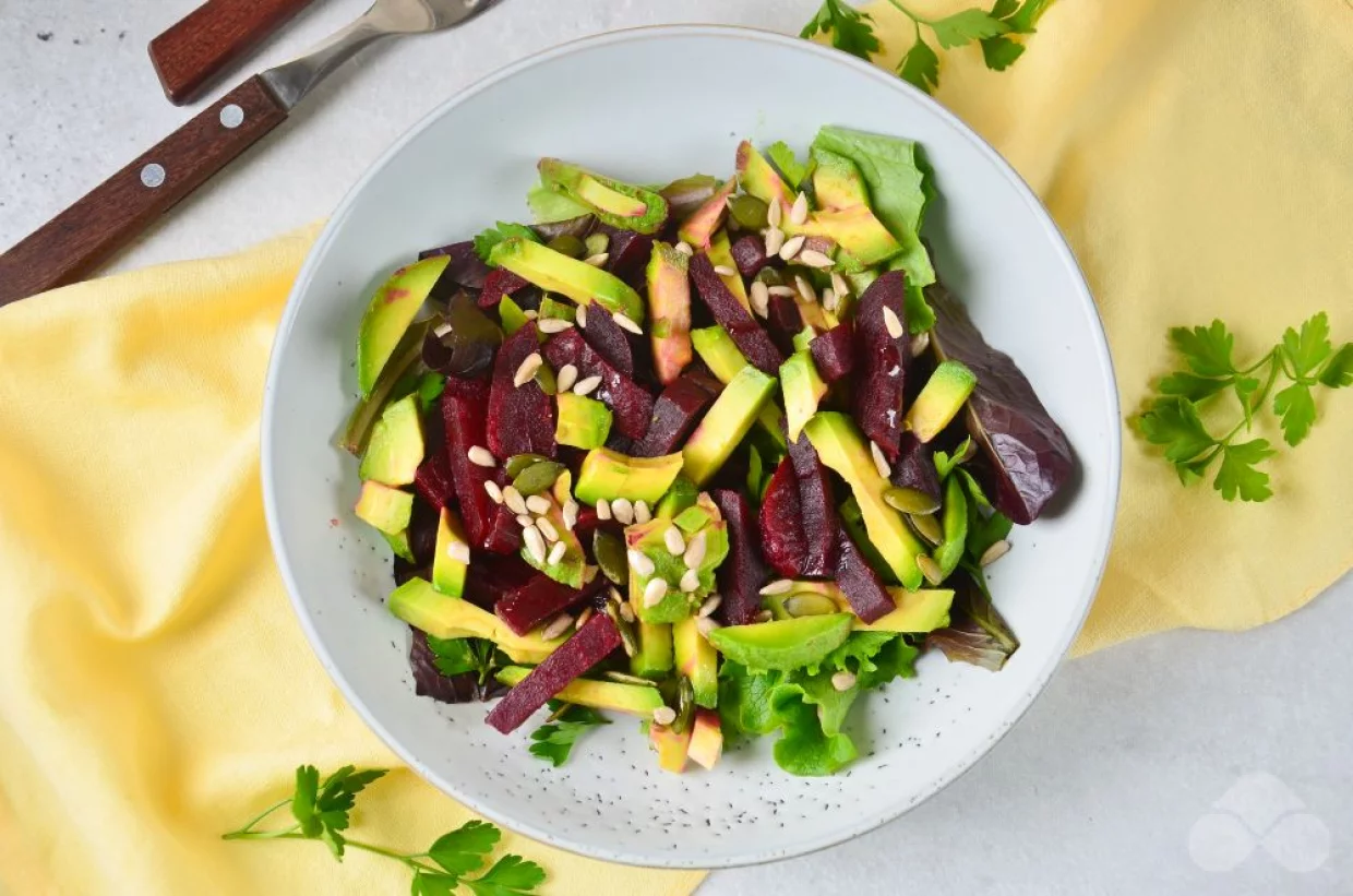 - Свекла – 2 штуки * Авокадо замороженное – 300 гр * Салатный микс – 140 г * Зелень – 1 пучок